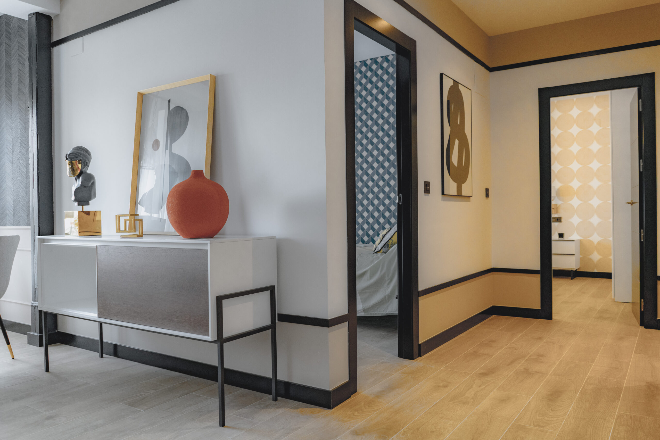 Este apartamento exclusivo y de diseño se destaca por su sofisticación y originalidad. La mezcla de colores cuidadosamente seleccionados crea una paleta vibrante y armoniosa, con pinceladas de naranja que añaden vitalidad y energía al espacio. La atención al detalle es evidente en cada rincón, desde los muebles de diseño elegante hasta los elementos decorativos únicos. La combinación de texturas y materiales de alta calidad crea una sensación de lujo y comodidad incomparable. Este apartamento es un verdadero oasis de estilo y sofisticación que refleja la personalidad de sus propietarios.